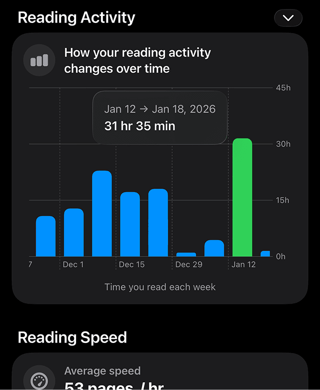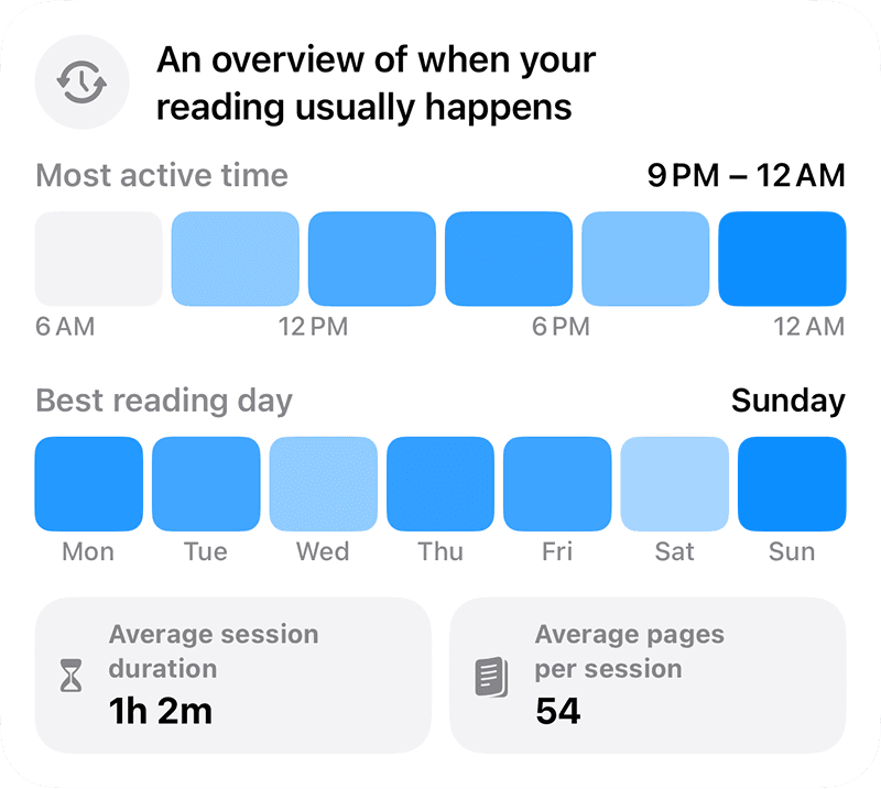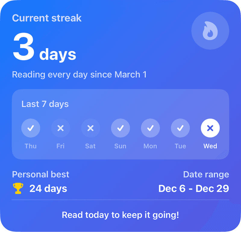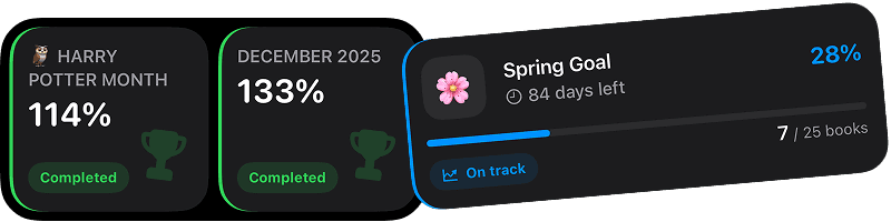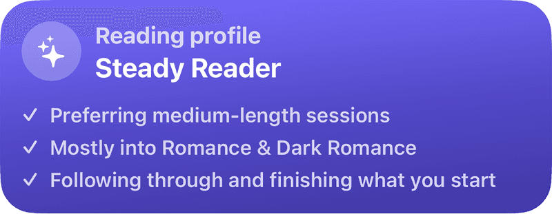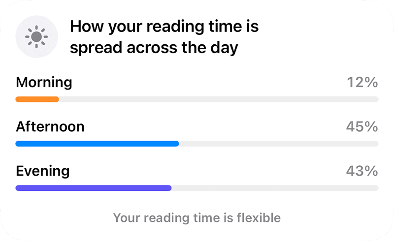Discover exactly how and when you read with clear streaks, completion percentages, and long-term trends.